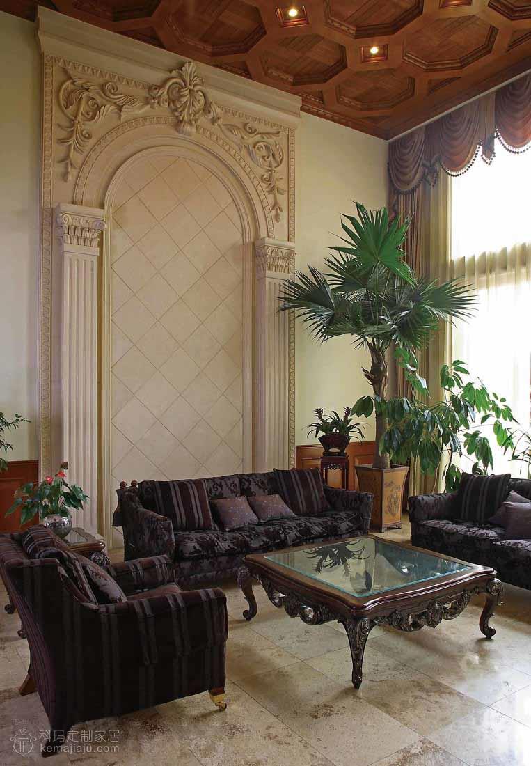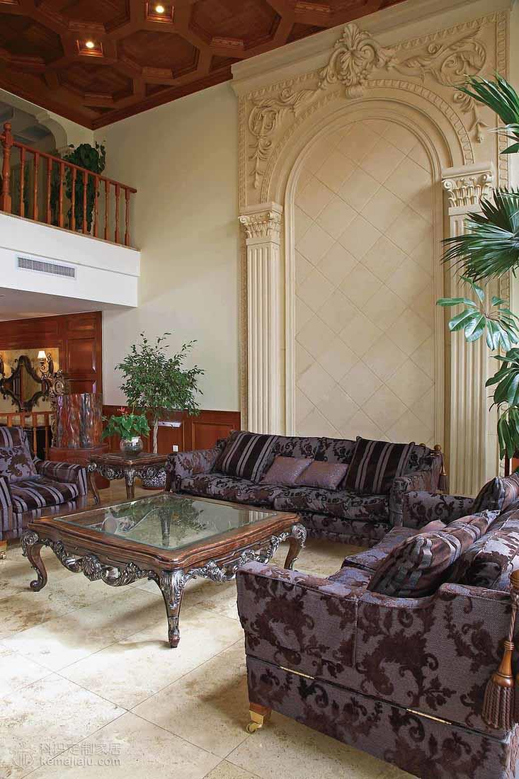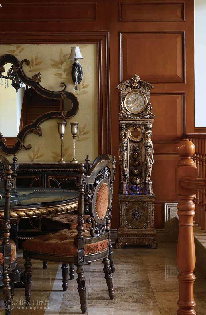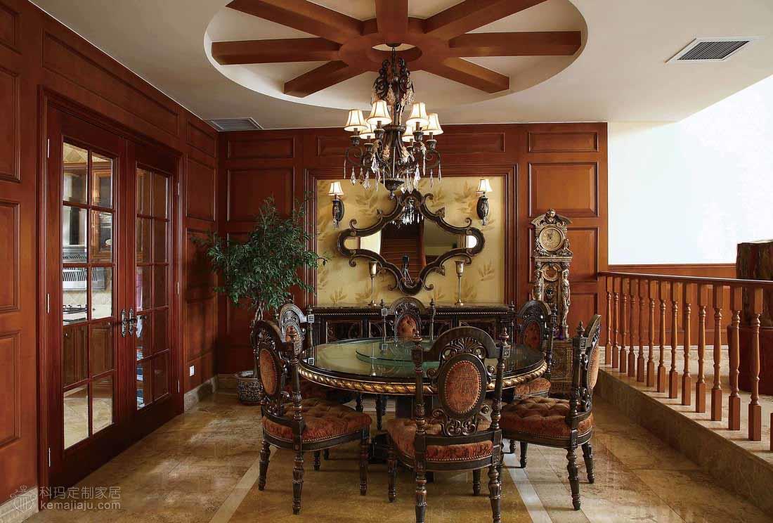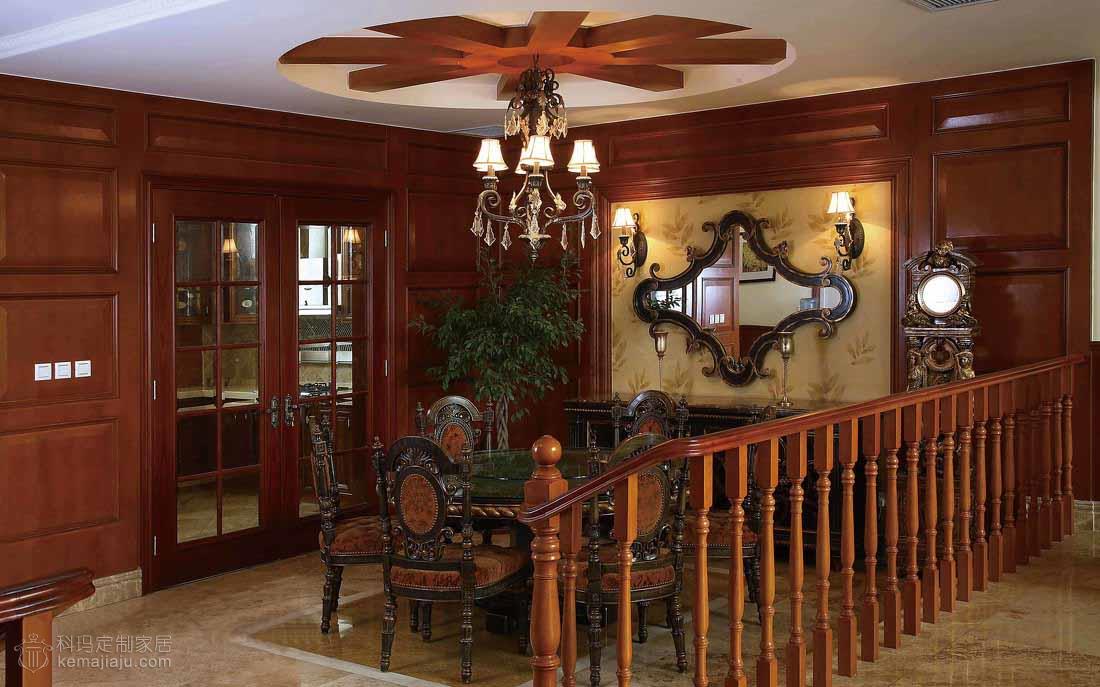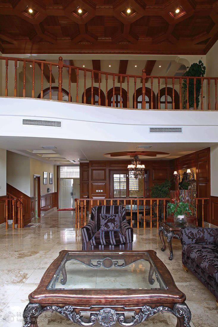 像是一个怀旧的欧洲贵族家庭的百年传奇故事,诠释着主人对豪宅整木风格的见解,不需感怀的故事,就可以窥视主人的豪情... 本案以咖啡色为主调,运用实木吊顶、实木护墙以及仿古色大理石,全力打造出一个豪华的别墅空间。客厅的大型砂岩背景墙搭配实木吊顶给人以坚实、浑厚的感觉,还隐约透着一丝自然的气息。餐厅和二层开放空间的协调统一衬托出一个大气的客厅环境。这一切都是那么经典别致,空间尽显古典但并不过于凝重,一角靠窗的绿植已经映射出一场夏的生机盎然。主卧书房的纯木质空间加以古铜色吊灯则像是流淌着一段历史的回忆。整个空间讲究经典与怀古,保持了整体空间适度坚实与浑厚。在设计上推崇典雅与高贵,在功能上更加细化家庭的功能空间。