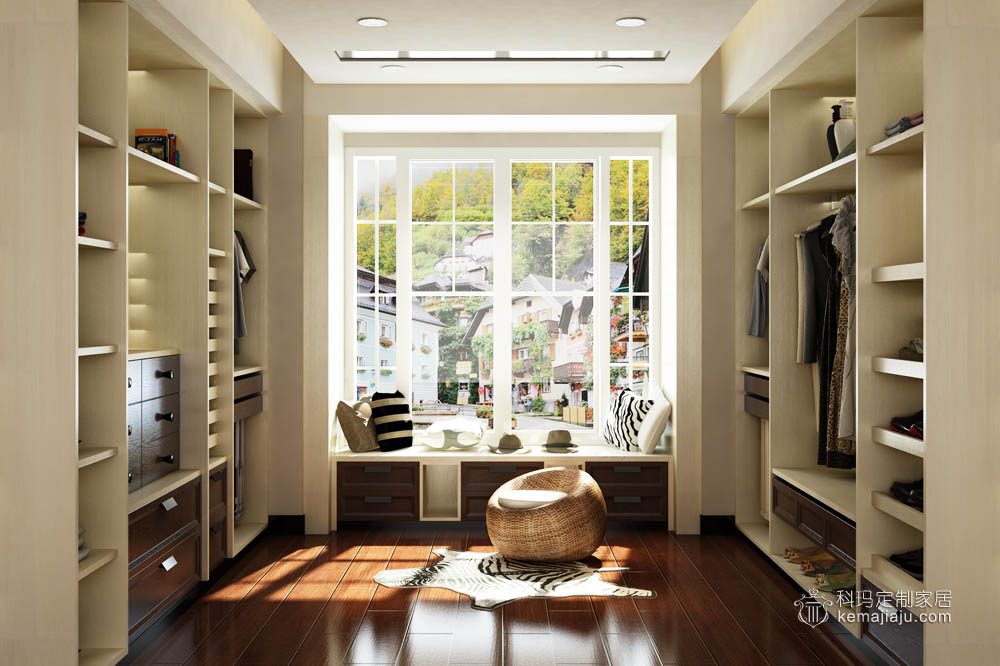 近几年,衣柜开始从墙外“钻”进了墙内,大大释放了空间,实用面积增大。建议正方形更衣室,可设计为U字形柜体,完全贴合壁面。深长形的房间,衣柜平行排布比较好,还可以保留1平方米左右的换衣空间。宽长形的房间在深度不是非常充足的情况之下,以L形的柜体设计为佳,这样就可以拥有最宽广的视觉效果及收纳性。此外,衣柜可以使用与墙壁相似的颜色,成为墙壁的组成部分,再或者运用镜子作柜面,在视觉上将狭小的空间作无限拓宽。